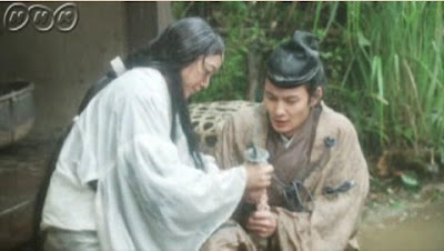 Surprised that the girl dared to touch Higekiri, Yoritomo asked what the heck was she going to do. Once again ignoring him, Masako struggled to keep the sword that Yoritomo was about to seize, such that the Genji prince stumbled into the wet garden. Not stopping, Masako jumped into the garden, forced Higekiri into Yoritomo’s hands and told the drenched wet Genji son that he must rise and take charge from now on. I gather that Masako wanted to use this chance to tell Yoritomo that message for the last time before her wedding.